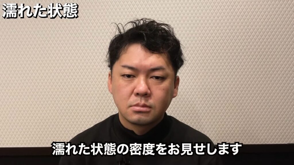 濡れた状態は、このとおりです。完全に透け感は無くなってはいませんが、だいぶ変わった印象です。