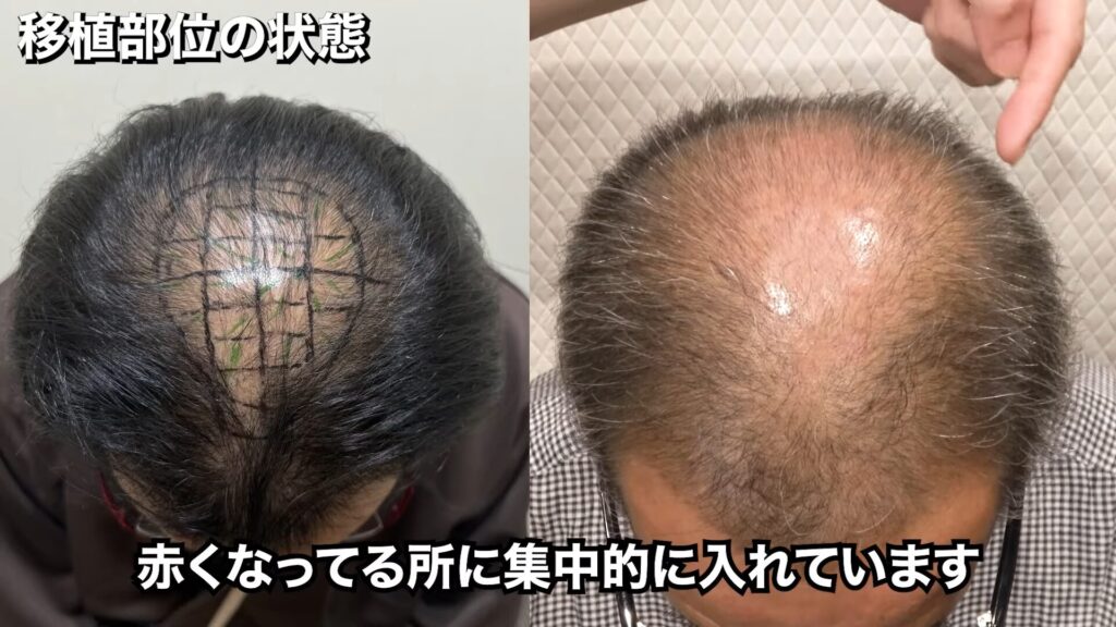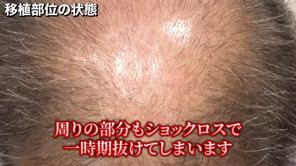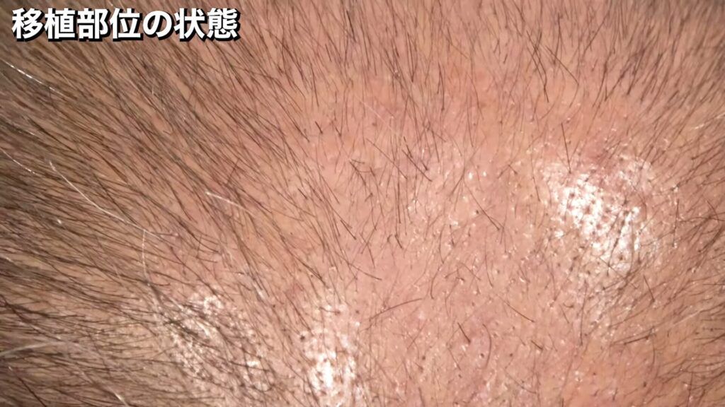 移植部分の状態は、このとおりです。ショックロスで、一時的に周りの毛が抜けています