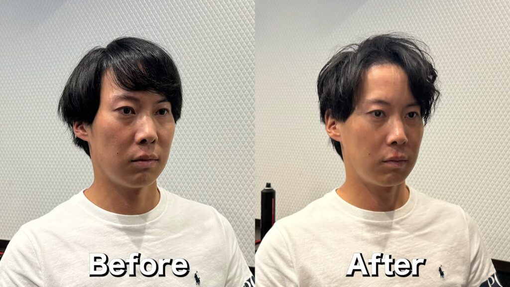 ヘアセット後は、このようになりました。前髪を上げていますが、増毛スプレーを使ったので薄い部分はそこまで目立っていません。