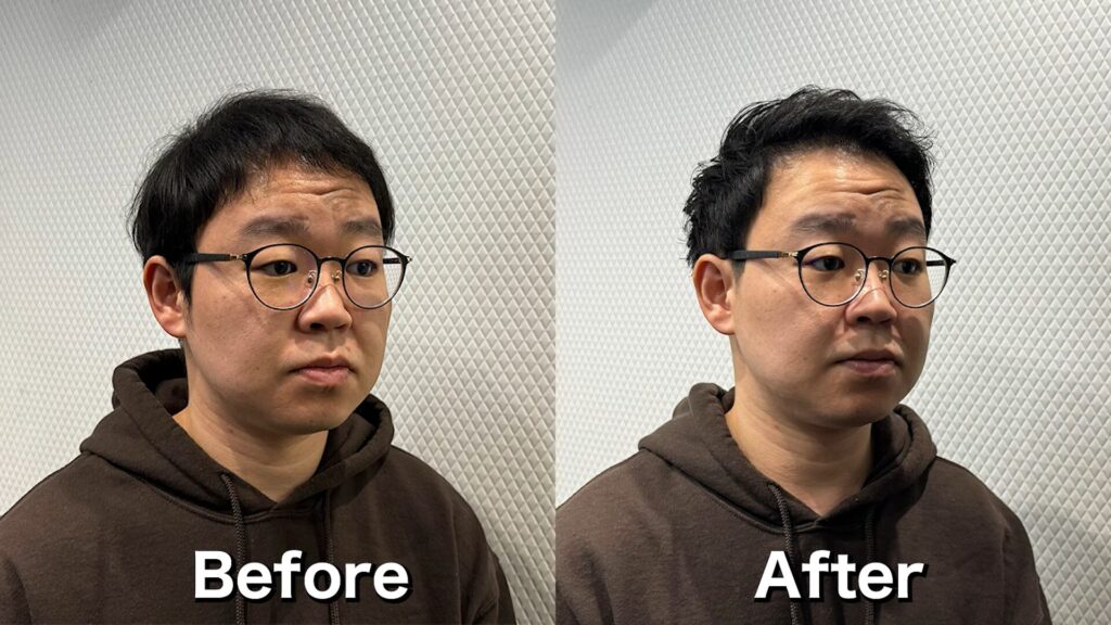 ヘアカット&ヘアセット後は、このようになりました。スッキリさせましたが、生え際のラインは気にならないと思います。